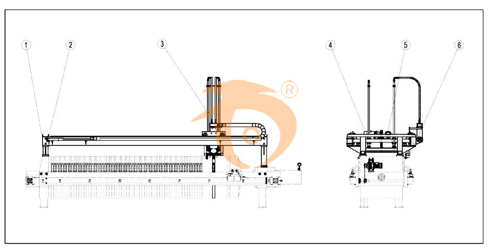 濾布清洗裝置主要由:①清洗裝置行走梁;②進水管;③水洗管;④升降裝置;⑤行走裝置;⑥限位電控系統六大部分組成。詳見圖